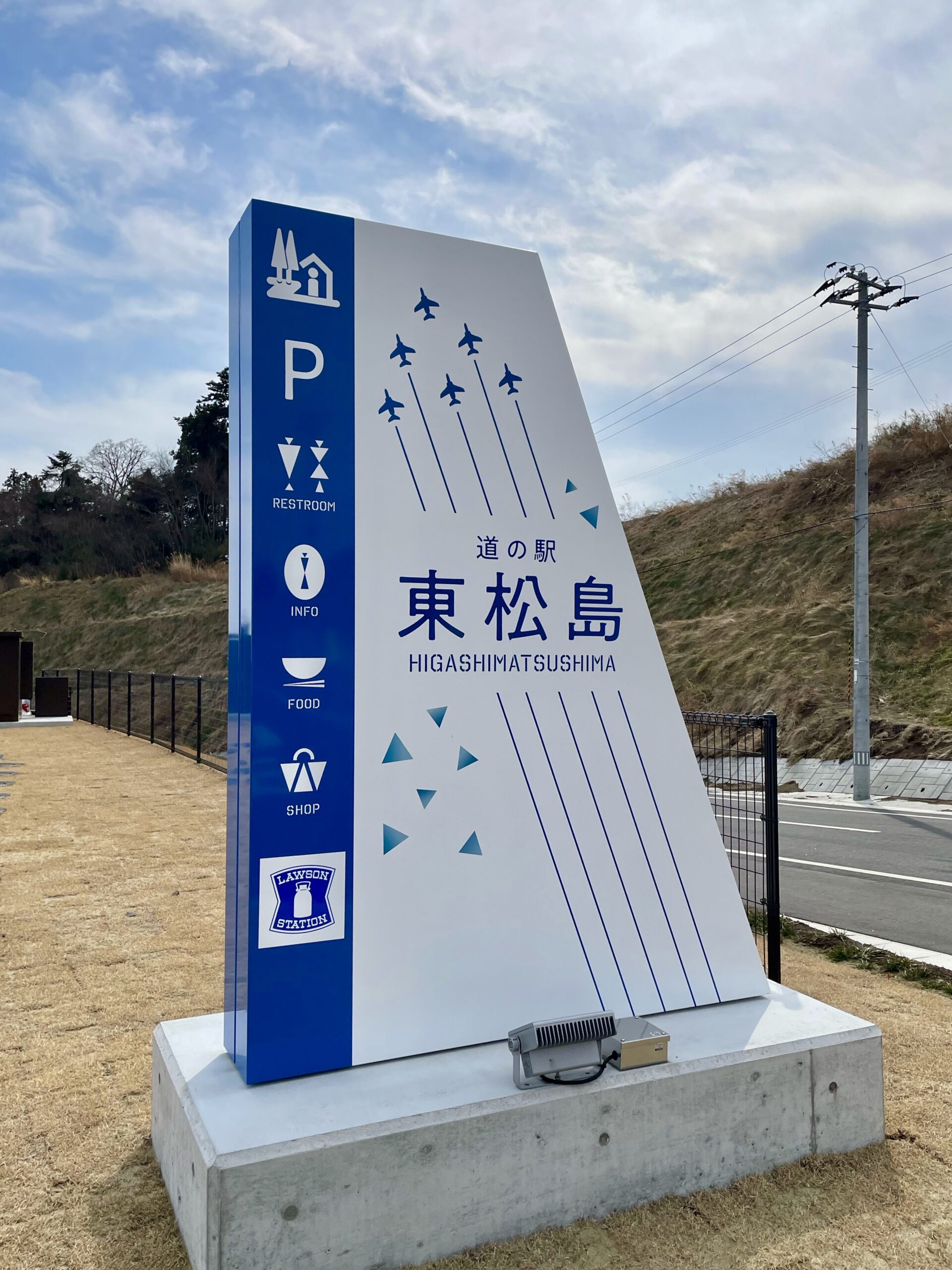 道の駅東松島の全体の案内サインのデザイン、防風パーテーション、ガラス部分のグラフィックデザインを担当しました。